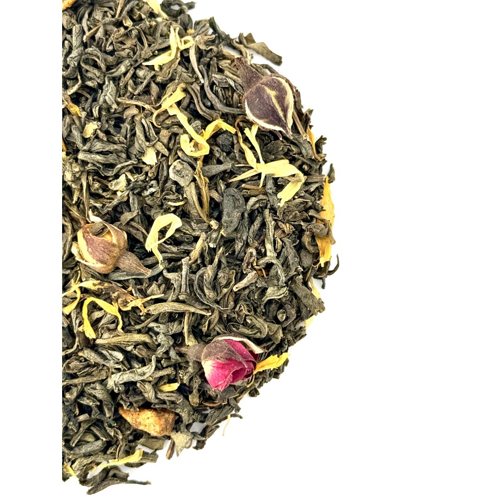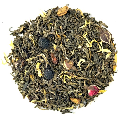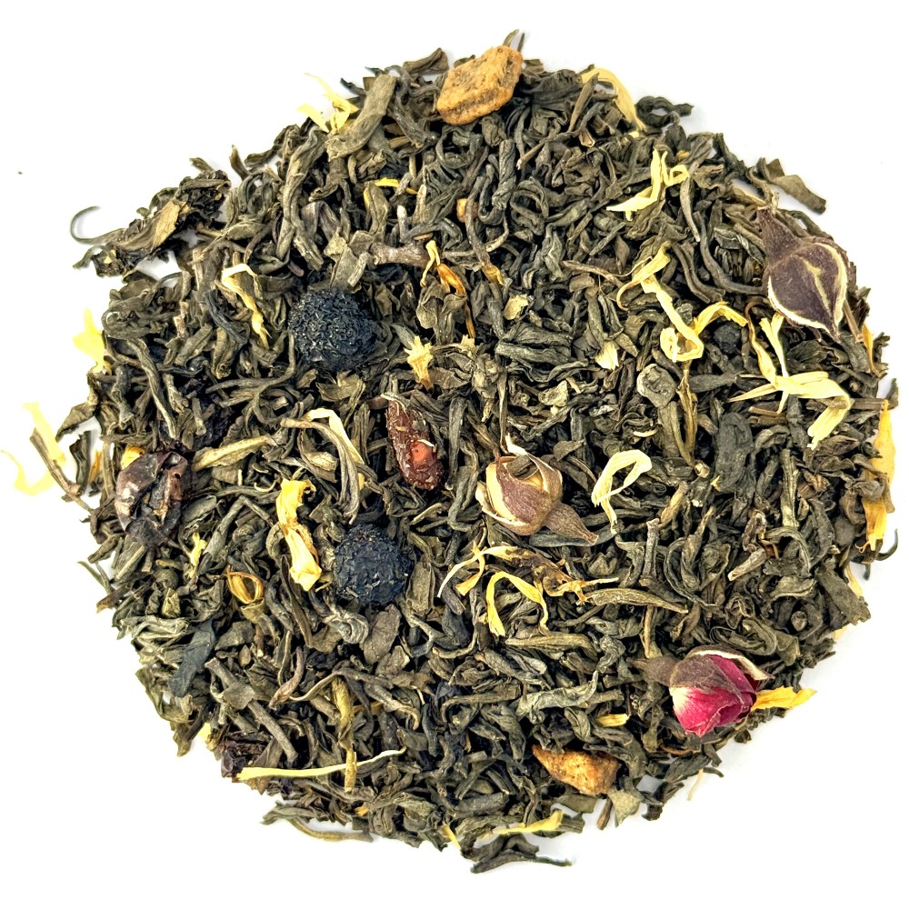 Зелений чай з ананасом, аронією ягодами калини, годжі, пелюстками нагідок та бутонами пномпеньської троянди. В його багатому ароматі - стйкі ноти маракуї посилюються ягідним шлейфом асаї.