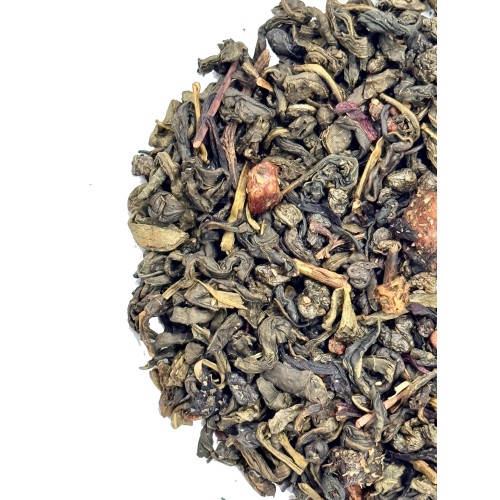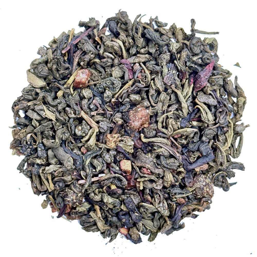 Зелений чай із шматочками ягід та трави суниці, листям гібіскусу та цедрою шипшини. Має солодкий стійкий смак, свіжий домінуючий аромат лісової суниці.