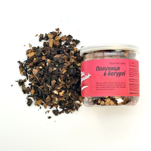 Фруктова суміш "Полуниця в йогурті" з пелюстками і шматочками полуниці, шипшиною, пелюстками каркаде і шматочками яблука. Має яскравий полуничний смак і аромат.