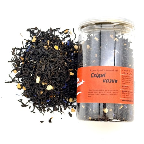 Чорний ароматизований чай "Східні казки" з шматочками ананаса, манго, маракуї, папайї, цедрою апельсина, з пелюстками волошки та соняшника.