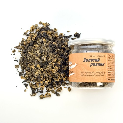 Чорний китайський чай "Золотий равлик" з великим вмістом (більше 50%) чайної бруньки. Має м'який смак з легкою кислинкою і тонкий аромат.