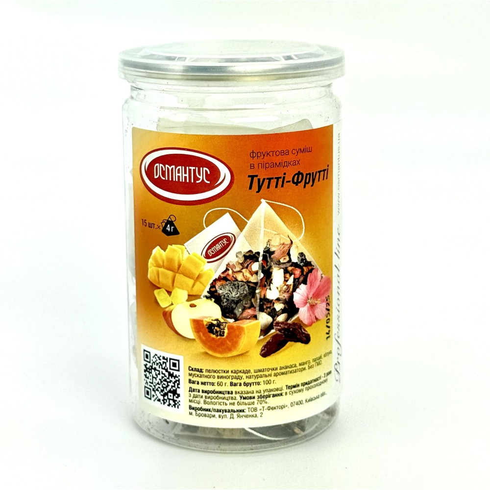 Фруктова суміш "Тутті-Фрутті" з пелюсток каркаде, шматочків ананаса, манго, папайї, яблука, мускатного винограду. Солодкий смак і насиченість вітамінами - поєднання приємного з корисним.