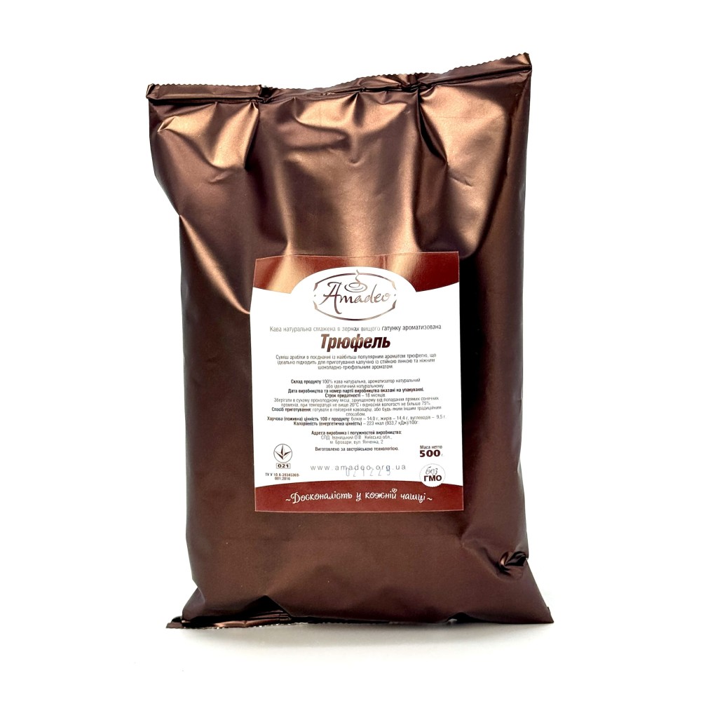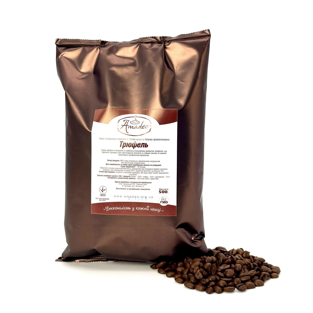 Суміш арабіки в поєднанні із найбільш популярним ароматом трюфелю, що ідеально підходить для приготування капучіно із стійкою пінкою та ніжним шоколадно-трюфельним ароматом.